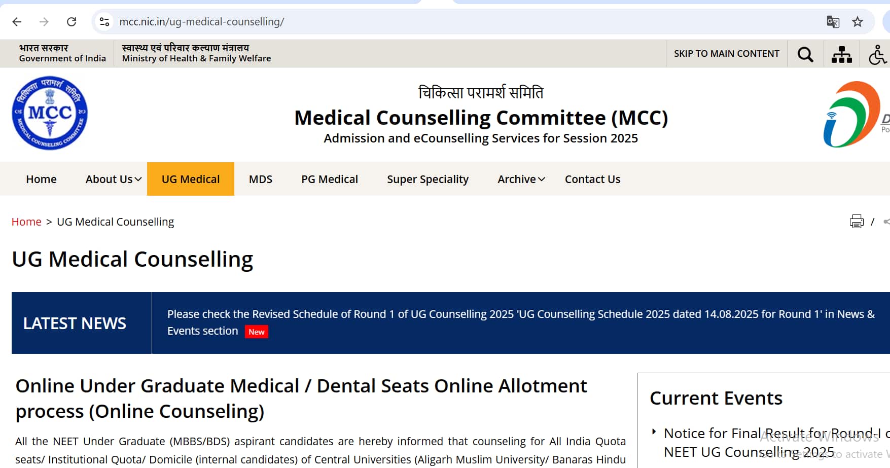 एमसीसी नीट यूजी काउंसलिंग 2025 राउंड 2 का आधिकारिक कार्यक्रम एमसीसी की वेबसाइट mcc.nic.in पर उपलब्ध है।