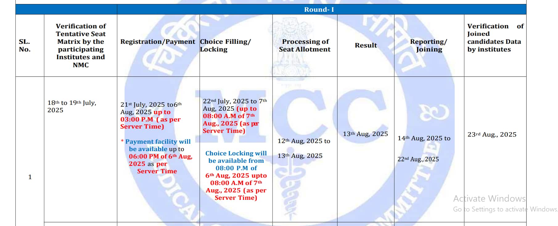 एमसीसी द्वारा चॉइस भरने की प्रक्रिया 11 अगस्त तक बढ़ाया गया था। प्राधिकरण द्वारा 13 अगस्त को फाइनल नतीजे घोषित किए गए। इससे पहले राउंड 1 का परिणाम 11 अगस्त को घोषित होने वाला था, लेकिन इसे बाद में टाल दिया गया।