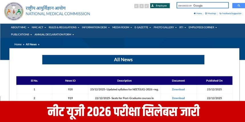 नई दिल्ली : राष्ट्रीय चिकित्सा आयोग के अधीन अंडर ग्रेजुएट मेडिकल एजुकेशन बोर्ड (UGMEB) ने नीट यूजी-2026 का फाइनल पाठ्यक्रम जारी कर दिया है। इसे उम्मीदवारों के लिए एनएमसी की आधिकारिक वेबसाइट पर अपलोड कर दिया गया है।