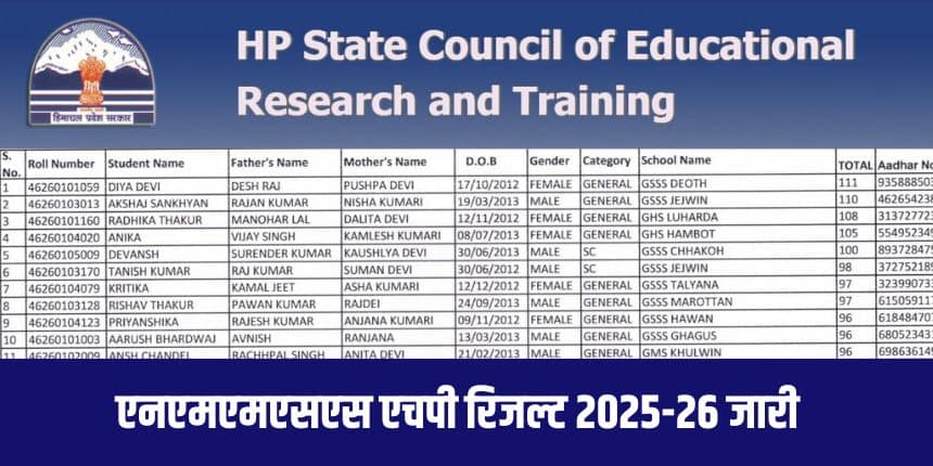 नई दिल्ली : राज्य शैक्षिक अनुसंधान एवं प्रशिक्षण परिषद (एससीईआरटी), सोलन, हिमाचल प्रदेश ने एनएमएमएस परीक्षा 2025-26 के परिणाम जारी कर दिए हैं। एनएमएमएस एचपी रिजल्ट जिलेवार मेरिट सूची के रूप में पीडीएफ प्रारूप में जारी की गई है।