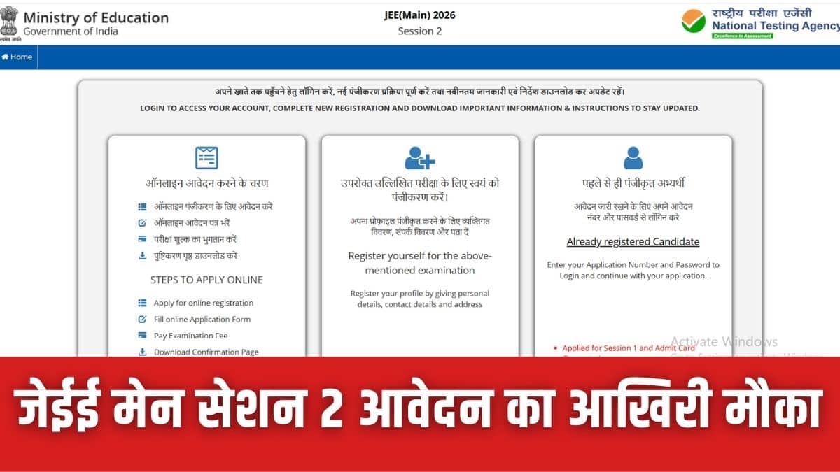 एनटीए द्वारा जेईई मेन 2026 सेशन 2 के लिए रजिस्ट्रेशन प्रोसेस 1 फरवरी से शुरू जारी है। जो स्टूडेंट्स पहले ही जेईई मेन सेशन 1 दे चुके हैं, उन्हें भी सेशन 2 के लिए अलग से रजिस्ट्रेशन कर सकते हैं और फीस ऑनलाइन जमा कर सकते हैं।