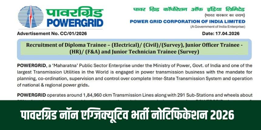 नई दिल्ली : पावरग्रिड कॉर्पोरेशन ऑफ इंडिया लिमिटेड ने विभिन्न गैर-कार्यकारी पदों पर भर्ती के लिए नोटिफिकेशन जारी किया है। इन रिक्तियों के लिए ऑनलाइन आवेदन प्रक्रिया 20 अप्रैल 2026 को शाम 5 बजे से शुरू होगी और आवेदन जमा करने और शुल्क भुगतान की अंतिम तिथि 11 मई 2026 को रात 11:59 बजे तक है।