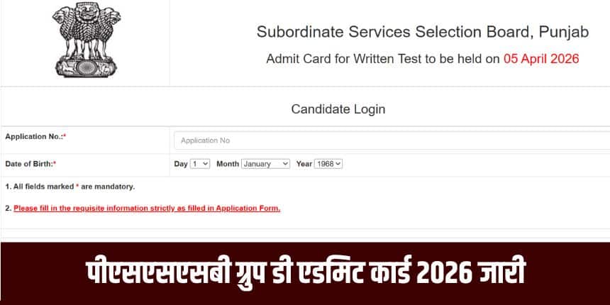 नई दिल्ली : पंजाब अधीनस्थ सेवा चयन बोर्ड (पीएसएसएसबी) ने ग्रुप डी भर्ती परीक्षा 2026 के लिए एडमिट कार्ड जारी कर दिया है। परीक्षा के लिए पंजीकृत उम्मीदवार आधिकारिक वेबसाइट sssb.punjab.gov.in के माध्यम से अपना एडमिट कार्ड डाउनलोड कर सकते हैं।