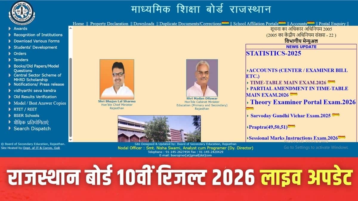 राजस्थान माध्यमिक शिक्षा बोर्ड (आरबीएसई) द्वारा कक्षा 10वीं का परिणाम 2026, आज जारी किया जाना संभावित है।
