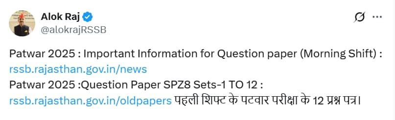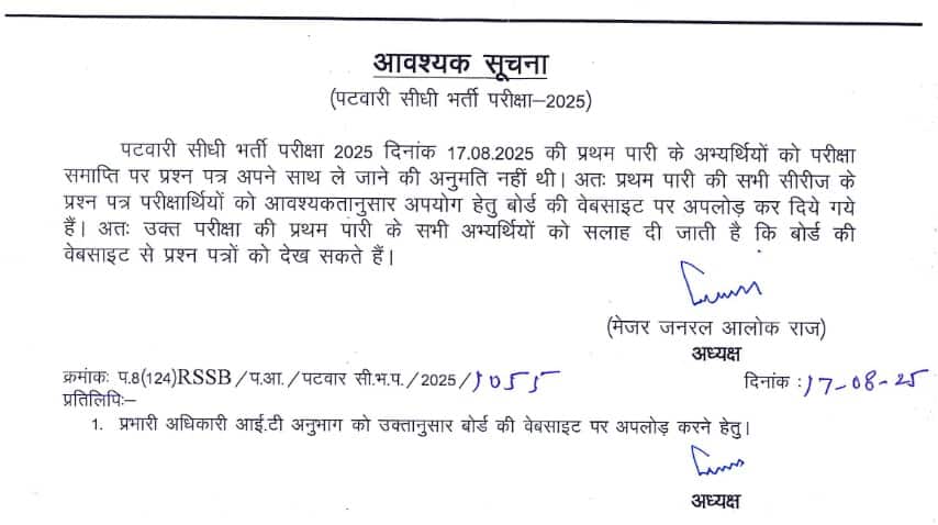 राजस्थान कर्मचारी चयन बोर्ड (आरएसएसबी) ने 17 अगस्त 2025 को आयोजित राजस्थान पटवारी भर्ती परीक्षा 2025 की पहली पाली (शिफ्ट 1) के सभी सेटों के प्रश्न पत्र आधिकारिक वेबसाइट rssb.rajasthan.gov.in पर जारी कर दिए हैं।