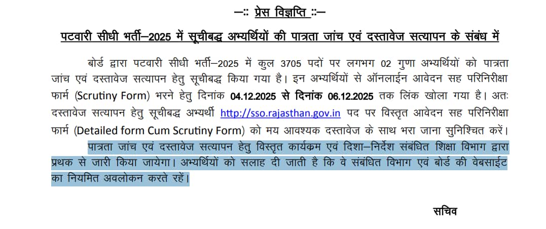 राजस्थान पटवारी परीक्षा 2025 में सफल उम्मीदवारों के लिए स्क्रूटनी फॉर्म भरने के लिए 4 से 6 दिसंबर, 2025 तक लिंक सक्रिय किया गया है।