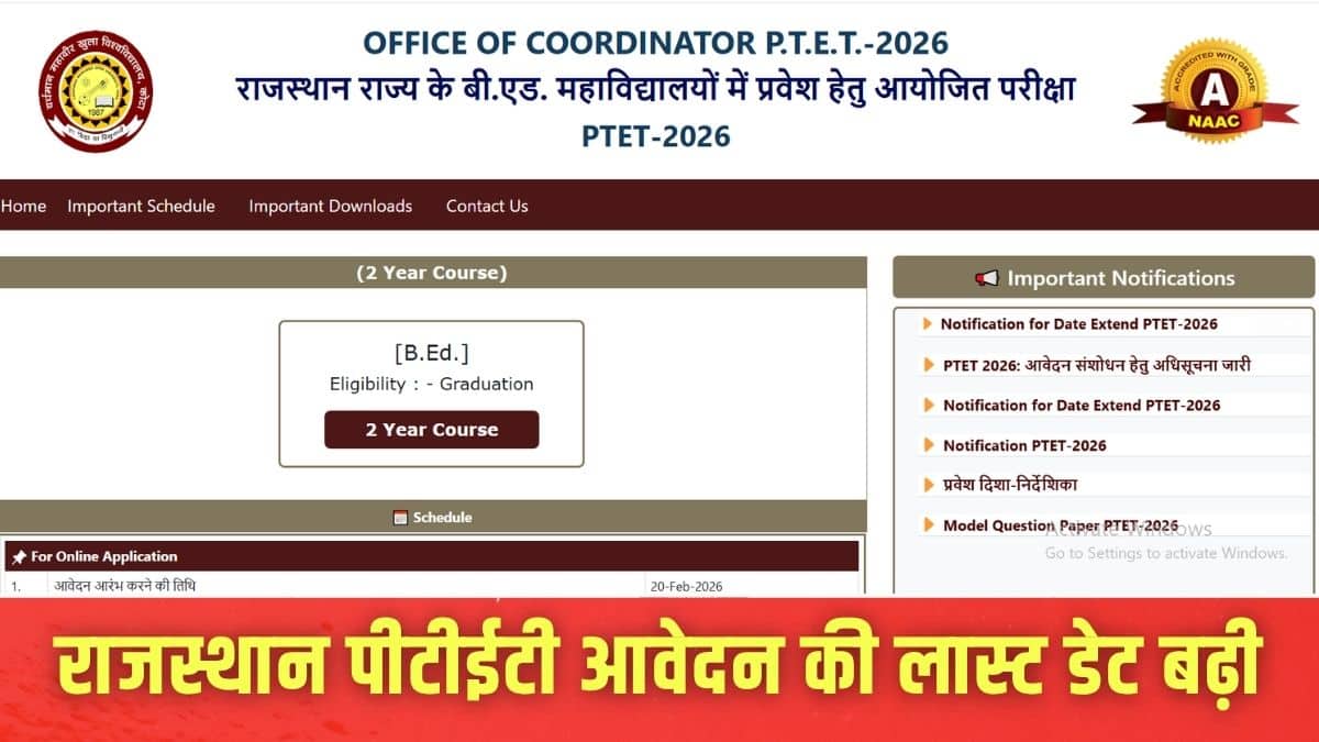 नई दिल्ली: वर्धमान महावीर ओपन यूनिवर्सिटी (वीएमओयू), कोटा ने राजस्थान प्री-टीचर एजुकेशन टेस्ट (पीटीईटी) 2026 के लिए रजिस्ट्रेशन की आखिरी तारीख एक बार फिर बढ़ा दी है। उम्मीदवार अब 5 मई तक ऑनलाइन आवेदन कर सकते हैं। यह जानकारी आधिकारिक वेबसाइट ptetvmoukota2026.in पर उपलब्ध है। पहले, आखिरी तारीख 20 अप्रैल थी; लेकिन, छात्रों के अनुरोधों और अन्य कारणों को देखते हुए यह समय सीमा बढ़ा दी गई है।
