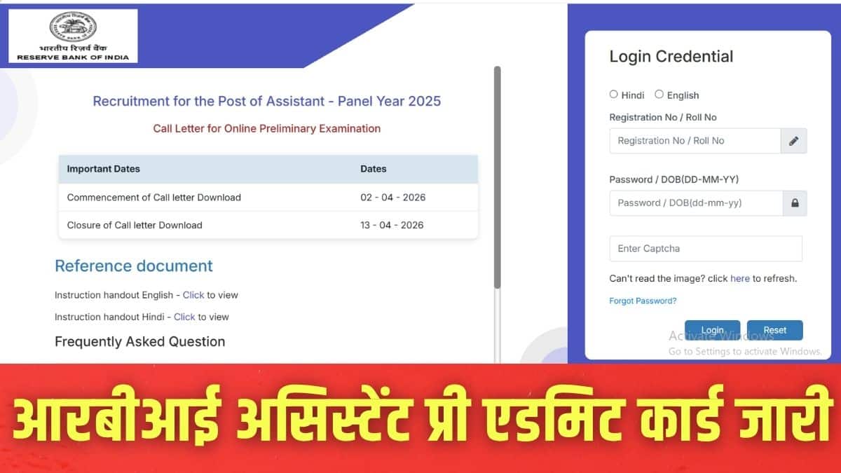 नई दिल्ली: भारतीय रिजर्व बैंक (आरबीआई) ने असिस्टेंट भर्ती 2026 की प्रारंभिक परीक्षा के लिए एडमिट कार्ड जारी कर दिए हैं। उम्मीदवार अब आधिकारिक वेबसाइट rbi.org.in से अपने एडमिट कार्ड डाउनलोड कर सकते हैं। यह भर्ती अभियान कुल 650 असिस्टेंट पदों के लिए आयोजित किया जा रहा है, जिसमें विभिन्न श्रेणियों के उम्मीदवार शामिल हैं। आरबीआई असिस्टेंट प्री एडमिट कार्ड डाउनलोड करने की प्रक्रिया इस लेख में आगे है।