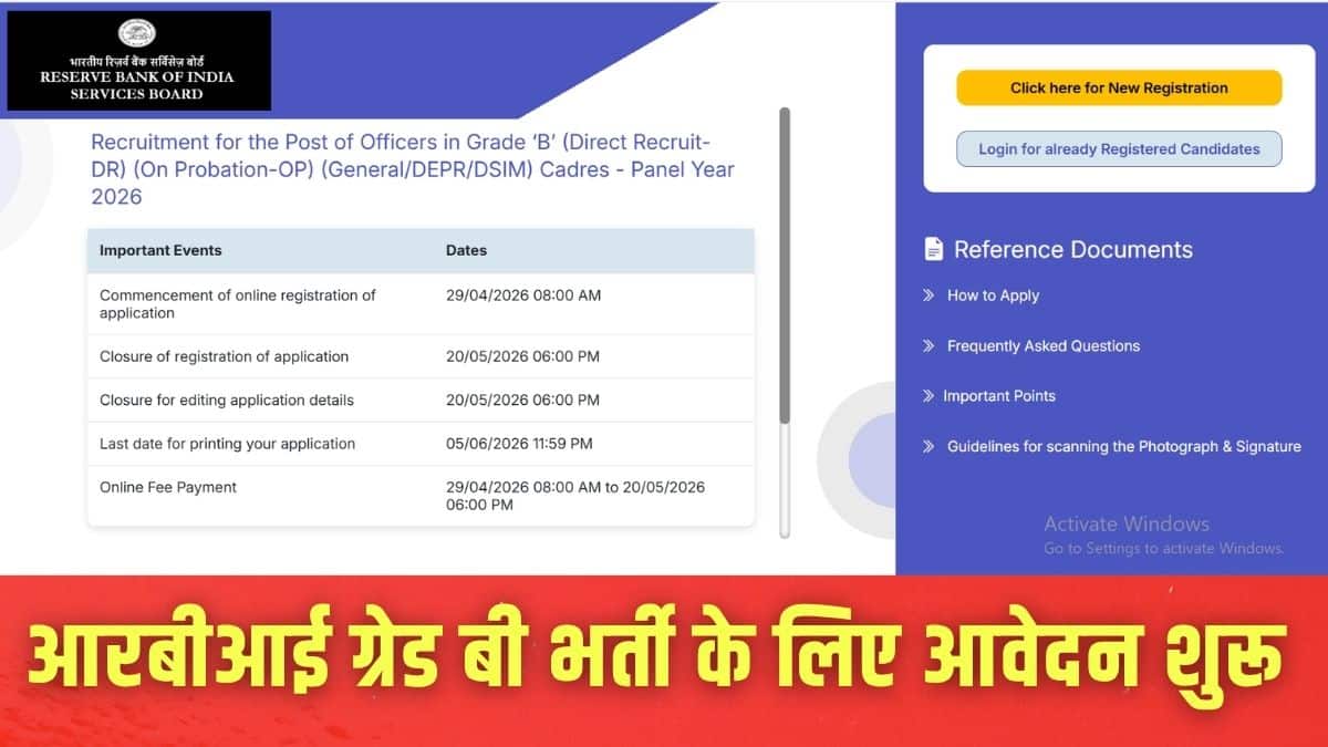 नई दिल्ली: भारतीय रिजर्व बैंक (आरबीआई) ने अपनी आधिकारिक वेबसाइट rbi.org.in पर आरबीआई ग्रेड बी अधिकारी भर्ती 2026 के लिए विस्तृत अधिसूचना जारी कर दी है। कुल 60 पदों की भर्ती के लिए आवेदन प्रक्रिया आज से शुरू हो गई है। आरबीआई ग्रेड बी पदों में जनरल, डीईपीआर और डीएसआईएम स्ट्रीम के तहत रिक्तियां शामिल हैं। आरबीआई ग्रेड बी भर्ती के लिए आवेदन करने की अंतिम तिथि 20 मई को शाम 6 बजे तक तय की गई है।