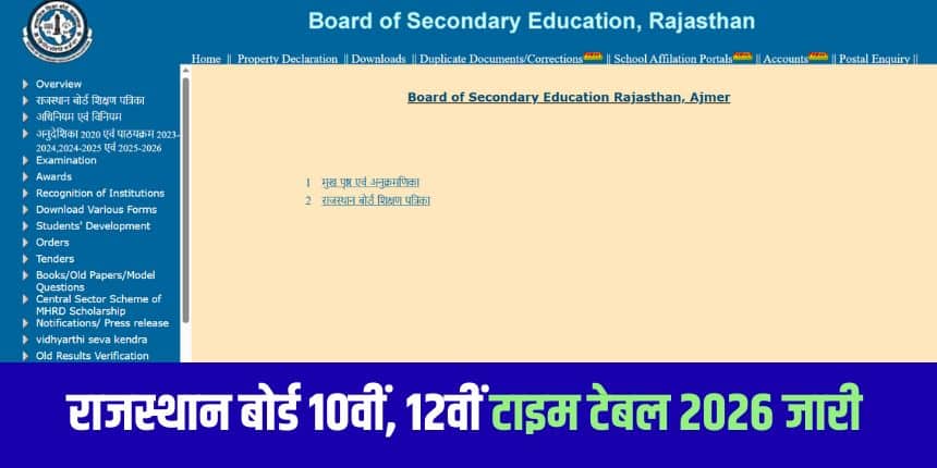 नई दिल्ली : राजस्थान माध्यमिक शिक्षा बोर्ड (आरबीएसई) ने वर्ष 2026 की बोर्ड परीक्षाओं के लिए टाइम टेबल जारी कर दिया है। राजस्थान बोर्ड कक्षा 10वीं और 12वीं की परीक्षाएं 12 फरवरी से शुरू होंगी। बोर्ड सचिव गजेंद्र सिंह राठौड़ ने परीक्षा कार्यक्रम के बारे में जानकारी साझा की है।