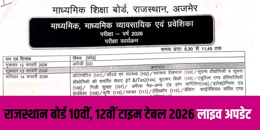 राजस्थान माध्यमिक शिक्षा बोर्ड (आरबीएसई) ने वर्ष 2026 की बोर्ड परीक्षाओं के लिए टाइम टेबल जारी कर दिया है। राजस्थान बोर्ड कक्षा 10वीं और 12वीं की परीक्षाएं 12 फरवरी से शुरू होंगी। बोर्ड सचिव गजेंद्र सिंह राठौड़ ने परीक्षा कार्यक्रम के बारे में जानकारी साझा की है।