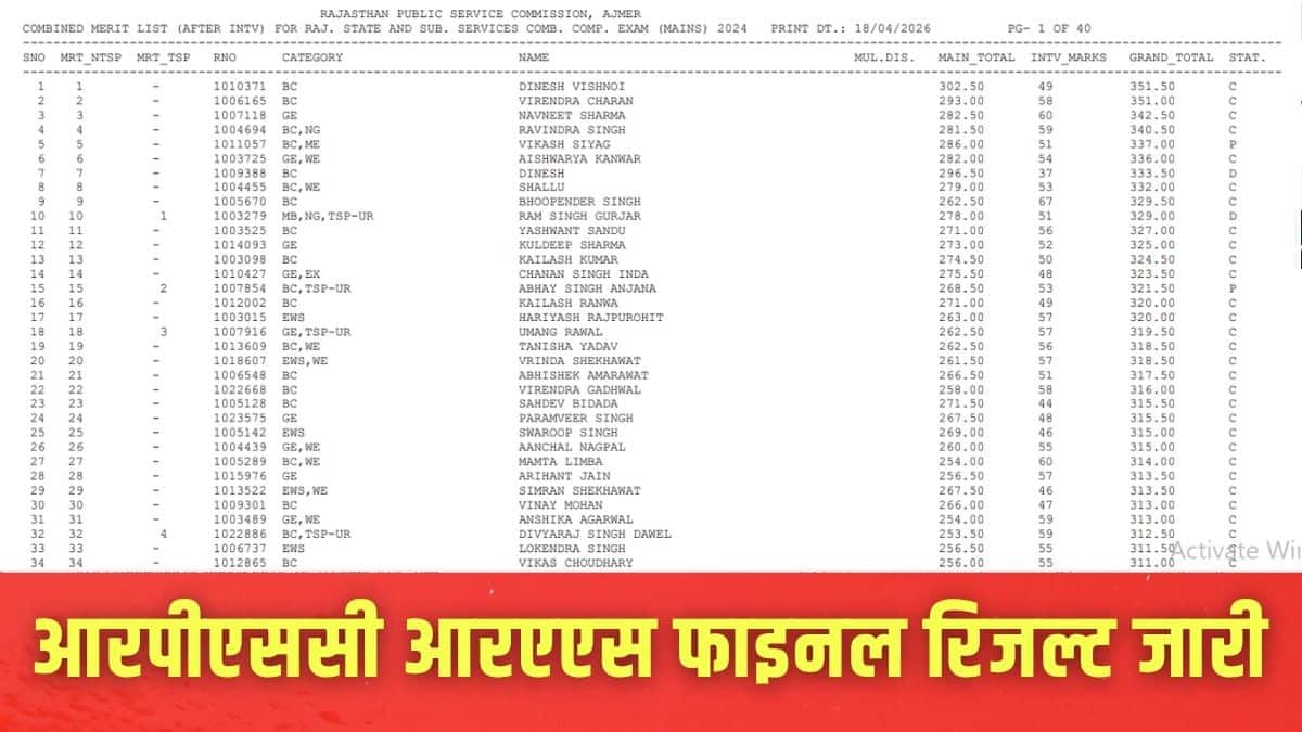 नई दिल्ली: राजस्थान लोक सेवा आयोग (आरपीएससी) ने आरएएस 2024 परीक्षा के अंतिम परिणामों की घोषणा कर दी है। साक्षात्कार के बाद संयुक्त मेरिट सूची और अंतिम परिणाम आधिकारिक वेबसाइट rpsc.rajasthan.gov.in पर जारी कर दिए गए हैं। आरपीएससी आरएएस 2024 परीक्षा में दिनेश बिश्नोई ने पूरे राजस्थान राज्य में प्रथम स्थान हासिल किया है। उन्होंने कुल 351.50 अंकों के साथ परीक्षा में शीर्ष स्थान प्राप्त किया है।