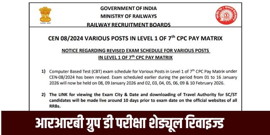 आरआरबी ग्रुप डी के संशोधित परीक्षा कार्यक्रम के मुताबिक परीक्षाएं 8 और 9 जनवरी 2026 तथा 2, 3, 4, 5, 6, 9 और 10 फरवरी 2026 होंगी। इससे पहले, परीक्षा तिथियां 1 जनवरी से 16 जनवरी 2026 तक निर्धारित थीं।