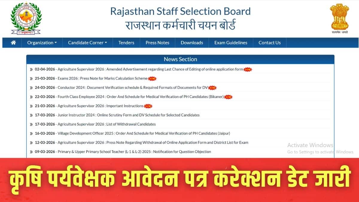 आरएसएसबी ने कृषि पर्यवेक्षक भर्ती के आवेदनों में संशोधन से जुड़े नियमों में बदलाव किया है। अब, परीक्षा से पहले सुधार के लिए कोई विंडो उपलब्ध नहीं होगी; इसके बजाय, यह परीक्षा के बाद 28 अप्रैल से 4 मई तक सक्रिय रहेगी।