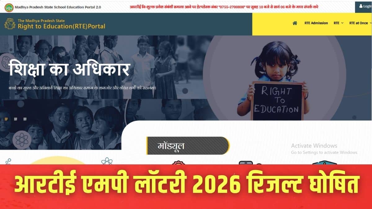 आवेदन प्रक्रिया 13 से 28 मार्च, 2026 तक चली। आरटीई एमपी लॉटरी रिजल्ट 2026 घोषित होने पर, अभिभावकों के पंजीकृत मोबाइल नंबरों पर एसएमएस संदेश भेजे गए हैं। चयनित बच्चों को स्कूल में निःशुल्क प्रवेश मिलेगा।