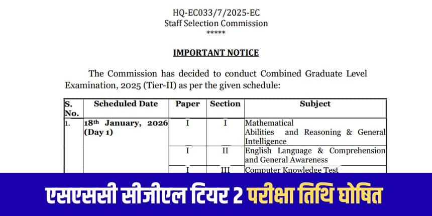 नई दिल्ली : कर्मचारी चयन आयोग (एससीसी) ने संयुक्त स्नातक स्तरीय (सीजीएल) टियर 2 परीक्षा की तिथि घोषित कर दी है। निर्धारित कार्यक्रम के अनुसार, टियर 2 परीक्षा 18 और 19 जनवरी 2026 को आयोजित की जाएगी। टियर 1 परीक्षा उत्तीर्ण कर चुके उम्मीदवार टियर 2 परीक्षा में बैठने के पात्र हैं।
