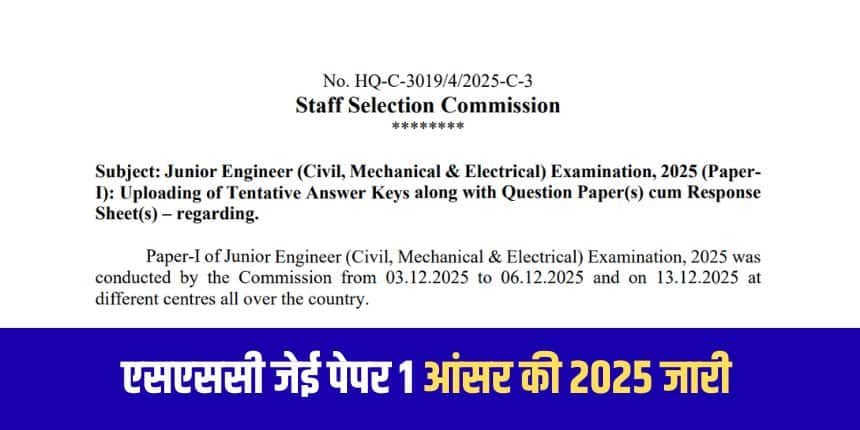 नई दिल्ली : कर्मचारी चयन आयोग (एसएससी) ने जूनियर इंजीनियर (जेई) भर्ती परीक्षा 2025 की संभावित उत्तर कुंजी जारी कर दी है। एसएससी जेई (सिविल, मैकेनिकल और इलेक्ट्रिकल इंजीनियरिंग) पेपर 1 में शामिल हुए उम्मीदवार आधिकारिक वेबसाइट ssc.gov.in के माध्यम से अपनी उत्तर कुंजी डाउनलोड कर सकते हैं।