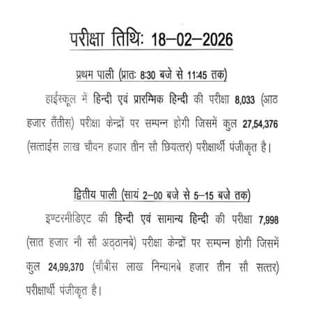 यूपी बोर्ड कक्षा 10वीं और 12वीं की परीक्षा 18 फरवरी को हिंदी विषय के लिए दो पालियों में कराई जा रही है।