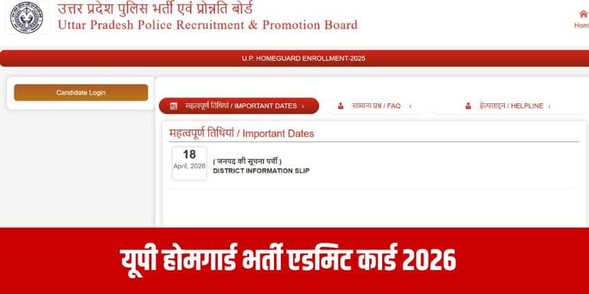 नई दिल्ली : उत्तर प्रदेश पुलिस भर्ती एवं प्रोन्नति बोर्ड (UPPRPB) द्वारा यूपी होमगार्ड भर्ती के लिए एडमिट कार्ड आज 22 अप्रैल 2026 को आधिकारिक वेबसाइट uppbpb.gov.in पर जारी किया जाएगा। जिन उम्मीदवारों ने यूपी होमगार्ड भर्ती के लिए आवेदन किया था, वे भर्ती बोर्ड की आधिकारिक वेबसाइट पर जाकर अपना एडमिट कार्ड डाउनलोड कर सकेंगे।