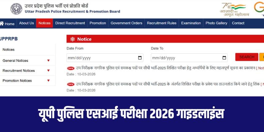 नई दिल्ली : उत्तर प्रदेश पुलिस भर्ती एवं प्रोन्नति बोर्ड द्वारा यूपी पुलिस सब इंस्पेक्टर (एसआई) भर्ती परीक्षा 14 और 15 मार्च कोआयोजित की जानी है। परीक्षा के लिए पंजीकृत उम्मीदवारों के लिए भर्ती बोर्ड ने एडमिट कार्ड भी जारी कर दिया है। उम्मीदवार यूपीपीबीपीबी की आधिकारिक वेबसाइट uppbpb.gov.in पर जाकर अपना एडमिट कार्ड डाउनलोड कर सकते हैं।