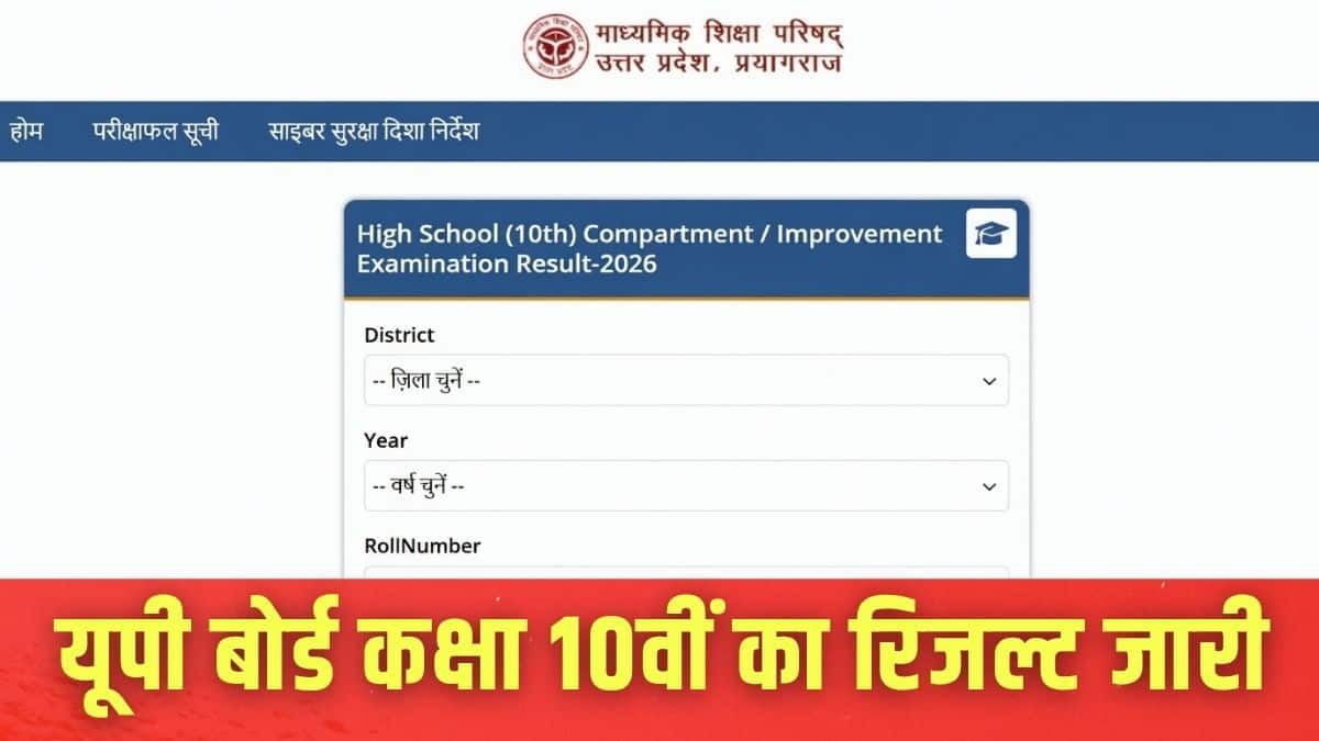 नई दिल्ली: उत्तर प्रदेश माध्यमिक शिक्षा परिषद (यूपीएमएसपी) ने कक्षा 10 की बोर्ड परीक्षाओं 2026 के परिणाम जारी कर दिए हैं। यूपी बोर्ड की कक्षा 10 की परीक्षाएं 18 फरवरी से 12 मार्च तक दो पालियों में आयोजित की गई। छात्र अपने रोल नंबर और स्कूल कोड दर्ज करके आधिकारिक वेबसाइटों upmsp.edu.in पर अपने परिणाम देख सकते हैं। यूपी बोर्ड कक्षा 10 में इस साल, 90.42 प्रतिशत छात्र उत्तीर्ण हुए हैं।