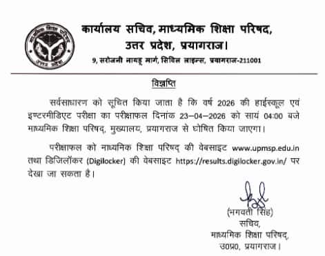 UPMSP UP Board Result 2026 Live Updates: उत्तर प्रदेश माध्यमिक शिक्षा परिषद (यूपीएमएसपी) द्वारा कल शाम 4 बजे यूपी बोर्ड रिजल्ट 2026 कक्षा 10वीं और 12वीं के लिए जारी किया जाएगा। यूपीएमएसपी यूपी बोर्ड रिजल्ट 2026 लिंक बोर्ड की आधिकारिक वेबसाइट upmsp.edu.in पर एक्टिव होगा। यूपीएमएसपी ने यूपी बोर्ड रिजल्ट डेट, टाइम की घोषणा अपने आधिकारिक ‘एक्स’ हैंडल पर जारी अधिसूचना के माध्यम से की। छात्रों का लंबा इंतजार अब खत्म होने वाला है। बोर्ड ने स्पष्ट रूप से बताया है कि दोनों कक्षाओं के परिणाम 23 अप्रैल को शाम 4 बजे प्रयागराज स्थित अपने मुख्यालय से जारी किए जाएंगे।