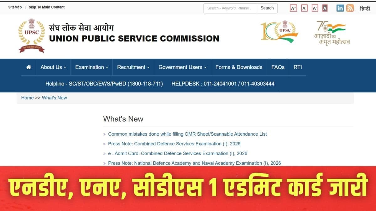 नई दिल्ली: संघ लोक सेवा आयोग (यूपीएससी) ने राष्ट्रीय रक्षा अकादमी और नौसेना अकादमी परीक्षा (एनडीए & एनए) 1 2026 और संयुक्त रक्षा सेवा परीक्षा (सीडीएस) I 2026 के लिए एडमिट कार्ड जारी कर दिए हैं। उम्मीदवार अब आधिकारिक वेबसाइटों upsc.gov.in और upsconline.nic.in से अपने ई-एडमिट कार्ड डाउनलोड कर सकते हैं। ये दोनों परीक्षाएं 12 अप्रैल को देश भर के विभिन्न परीक्षा केंद्रों पर आयोजित की जानी हैं।